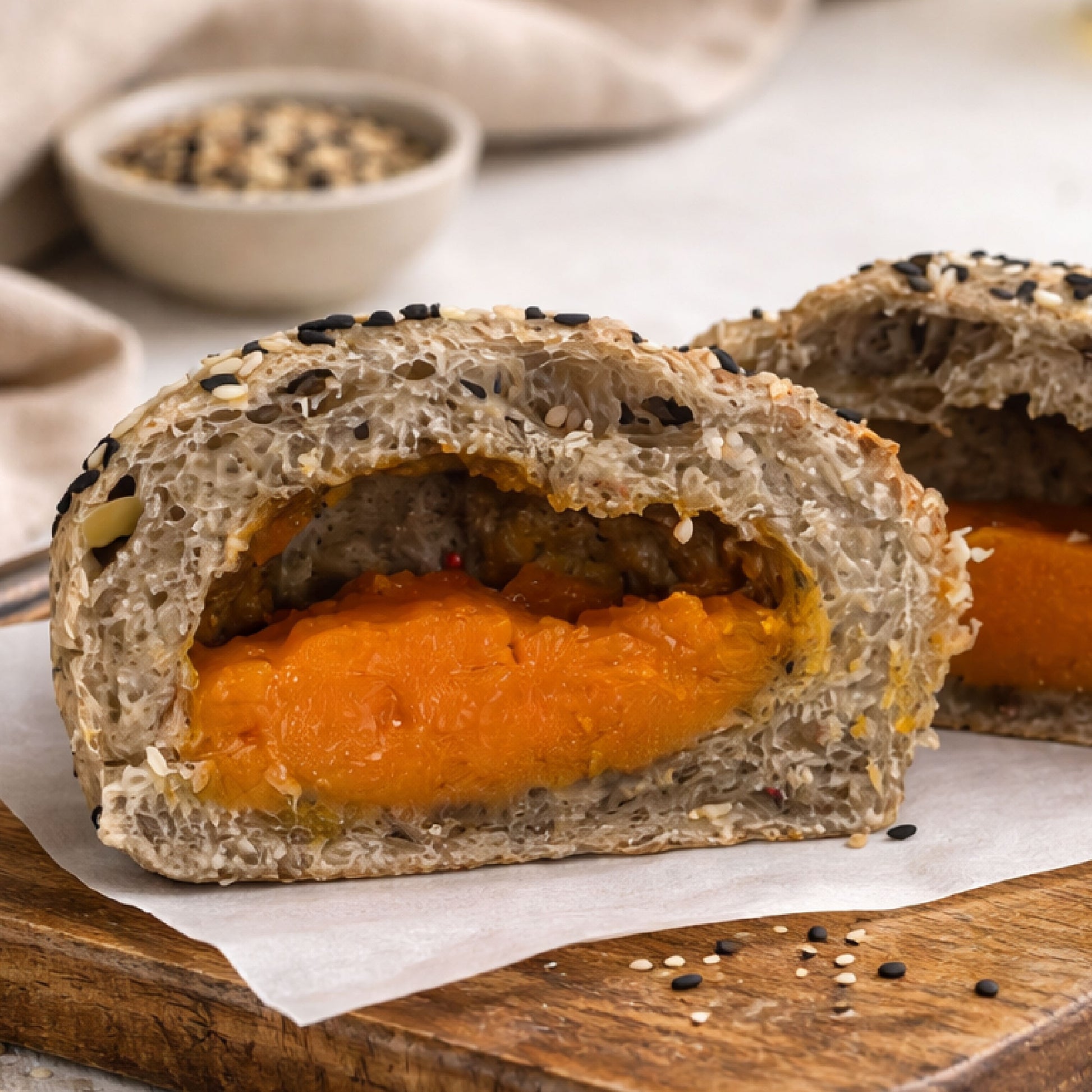 Soft sesame sourdough filled with velvety pumpkin for a naturally sweet, earthy taste. Wrapped in black sesame mixed seed dough for a rich, nutty flavor. Finished with a crunchy topping of sesame and pumpkin seeds!